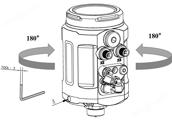 將定位器與閥門連接之后,定位器可與閥門之間做角度調(diào)整。若需要調(diào)整定位器操作界面角度,松開A處的內(nèi)六角緊定螺釘后,順時針或逆時針180°范圍內(nèi)調(diào)整到需要的角度,再擰緊緊定螺釘。